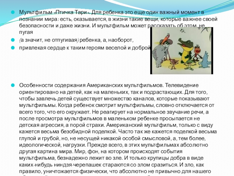 Особенности содержания Американских мультфильмов. Телевидение ориентировано на детей, как на маленьких, так и подрастающих. Для того, чтобы завлечь детей существует множество каналов, которые показывают мультфильмы. Когда ребенок смотрит мультфильмы, словно отключается от всего того, что его окружает. Не реагирует на нормальное звучание речи, а после просмотра мультфильмов в маленьком ребенке просыпается не детская агрессия, а порой страхи. Американский мультфильм, только с виду кажется весьма безобидной поделкой. Часто так же кажется поделкой весьма глупой и грубой, но, не несущей никакой особой смысловой, а, тем более, идеологической, нагрузки. Прежде всего, в этих мультфильмах абсолютно другая картина мира. Мир, фон, на котором происходят события мультфильма, безнадежно лежит во зле. И только крупицы добра в виде каких-нибудь ниндзя-черепашек стараются со злом сразиться. И зло, как правило, уничтожается физически, что абсолютно не привычно для нашего образа действия в сказках, где со злом старались бороться другими способами: его пытались перехитрить или уговорить.