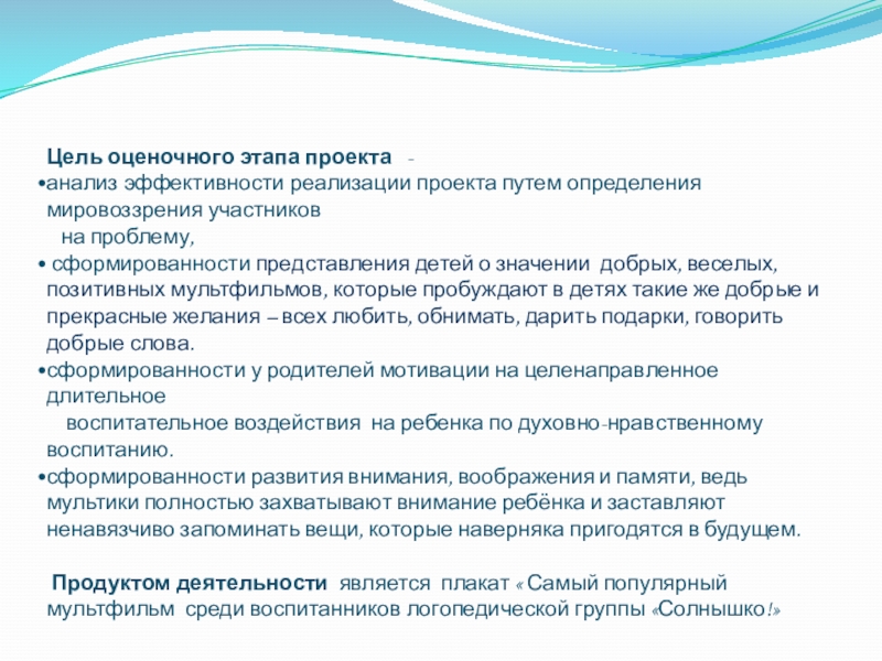 сформированности представления детей о значении добрых, веселых, позитивных мультфильмов, которые пробуждают в детях такие же добрые и прекрасные желания – всех любить, обнимать, дарить подарки, говорить добрые слова.