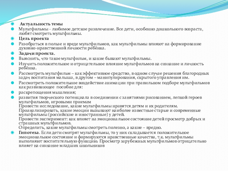 Изучить положительное и отрицательное влияние мультфильмов на сознание и личность ребёнка.