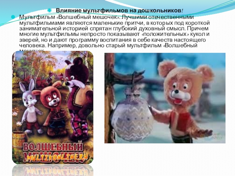 притчи, в которых под короткой занимательной историей спрятан глубокий духовный смысл. Причем многие мультфильмы непросто показывают «положительных» кукол и зверей, но и дают программу воспитания в себе качеств настоящего человека. Например, довольно старый мультфильм «Волшебный мешочек.