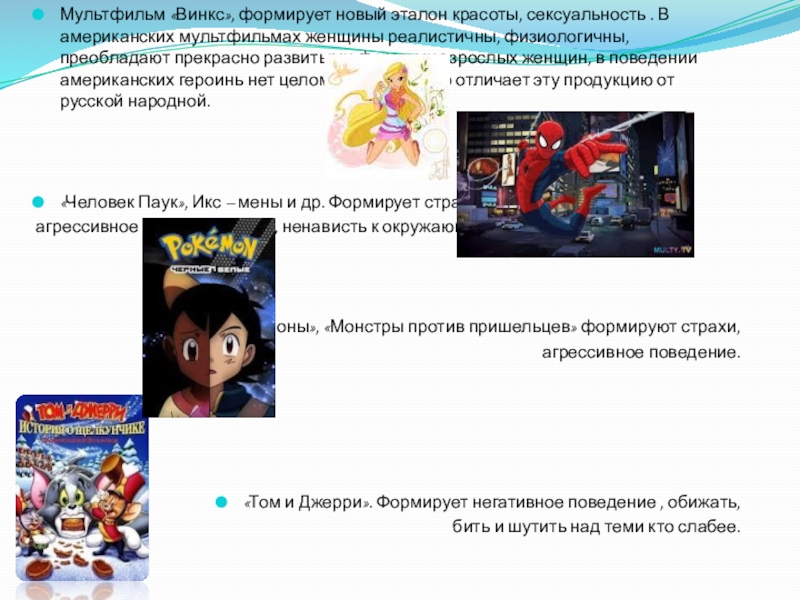Слайд 23Мультфильм «Винкс», формирует новый эталон красоты, сексуальность . В американских мультфильмах
