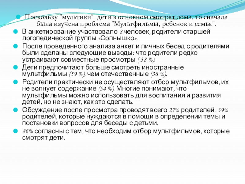 Слайд 4Поскольку "мультики" дети в основном смотрят дома, то сначала была изучена