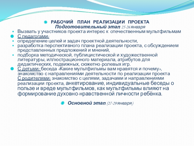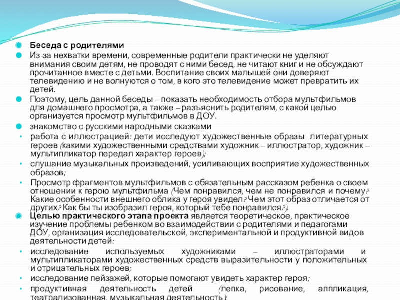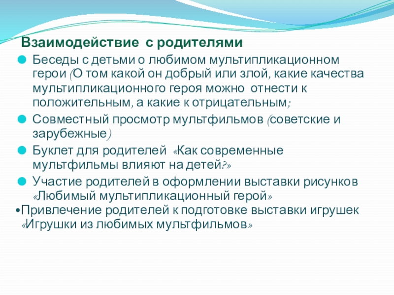 С родителями: знакомство с целями, задачами и направлениями реализации проекта, анкетирование, индивидуальные беседы о пользе и вреде мультфильмов, как мультфильмы влияют на формирование духовно-нравственной личности ребёнка.