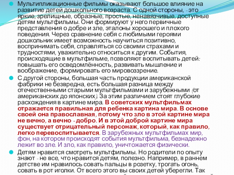 Слайд 24Мультипликационные фильмы оказывают большое влияние на развитие детей дошкольного возраста. С