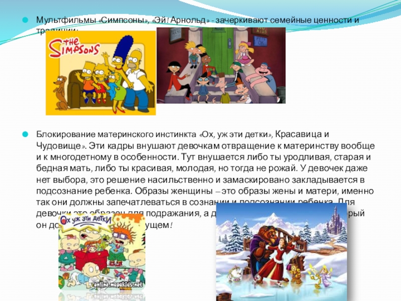 инстинкта «Ох, уж эти детки», Красавица и Чудовище». Эти кадры внушают девочкам отвращение к материнству вообще и к многодетному в особенности. Тут внушается либо ты уродливая, старая и бедная мать, либо ты красивая, молодая, но тогда не рожай. У девочек даже нет выбора, это решение насильственно и замаскировано закладывается в подсознание ребенка. Образы женщины – это образы жены и матери, именно так они должны запечатлеваться в сознании и подсознании ребенка. Для девочки это образец для подражания, а для мальчика это образец, который он должен выбрать в будущем!