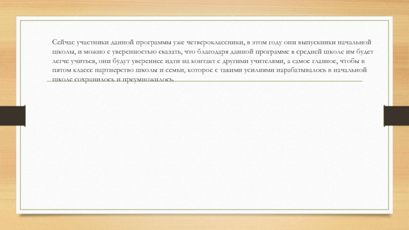 начальной школы, и можно с уверенностью сказать, что благодаря данной программе в средней школе им будет легче учиться, они будут увереннее идти на контакт с другими учителями, а самое главное, чтобы в пятом классе партнерство школы и семьи, которое с такими усилиями нарабатывалось в начальной школе сохранилось и преумножилось.