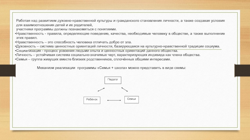 над развитием духовно-нравственной культуры и гражданского становления личности, а также создавая условия для взаимоотношения детей и их родителей,