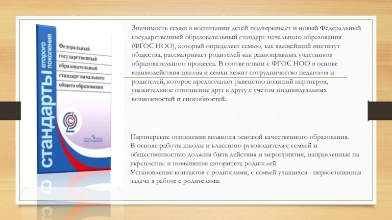 стандарт начального образования (ФГОС НОО), который определяет семью, как важнейший институт общества, рассматривает родителей как равноправных участников образовательного процесса. В соответствии с ФГОС НОО в основе взаимодействия школы и семьи лежит сотрудничество педагогов и родителей, которое предполагает равенство позиций партнеров, уважительное отношение друг к другу с учетом индивидуальных возможностей и способностей.