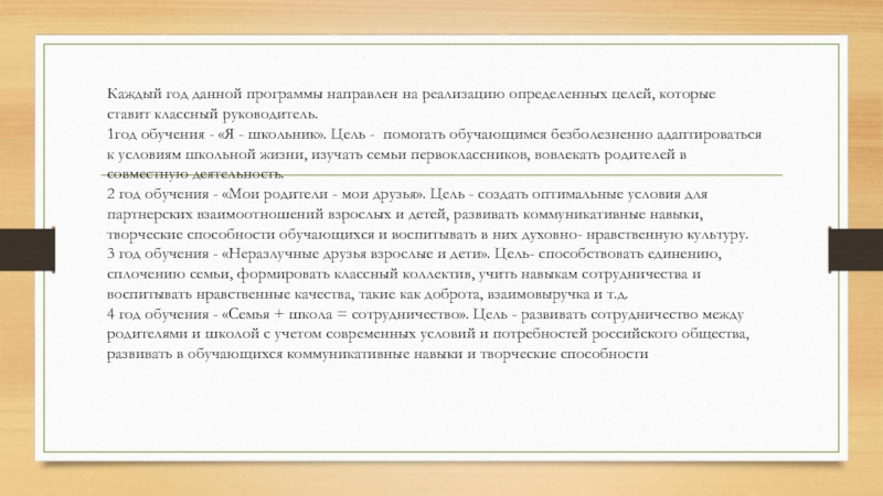 4 год обучения - «Семья + школа = сотрудничество». Цель - развивать сотрудничество между родителями и школой с учетом современных условий и потребностей российского общества, развивать в обучающихся коммуникативные навыки и творческие способности