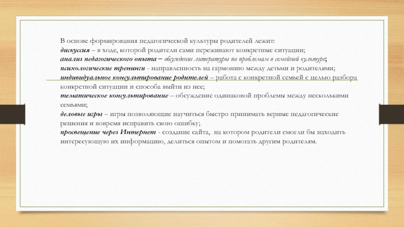 Слайд 6В основе формирования педагогической культуры родителей лежит: