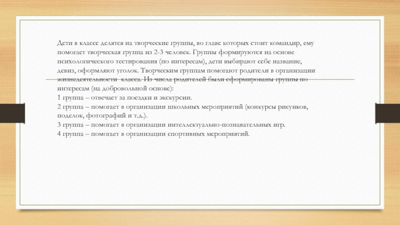 Слайд 9Дети в классе делятся на творческие группы, во главе которых стоит