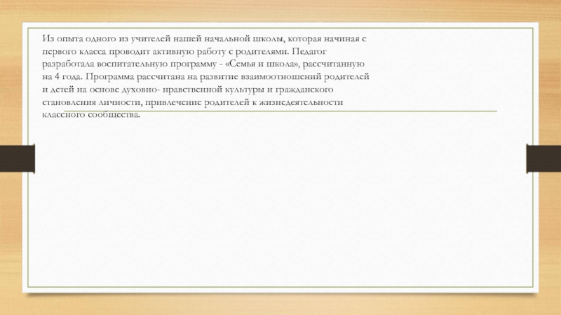 первого класса проводит активную работу с родителями. Педагог разработала воспитательную программу - «Семья и школа», рассчитанную на 4 года. Программа рассчитана на развитие взаимоотношений родителей и детей на основе духовно- нравственной культуры и гражданского становления личности, привлечение родителей к жизнедеятельности классного сообщества.
