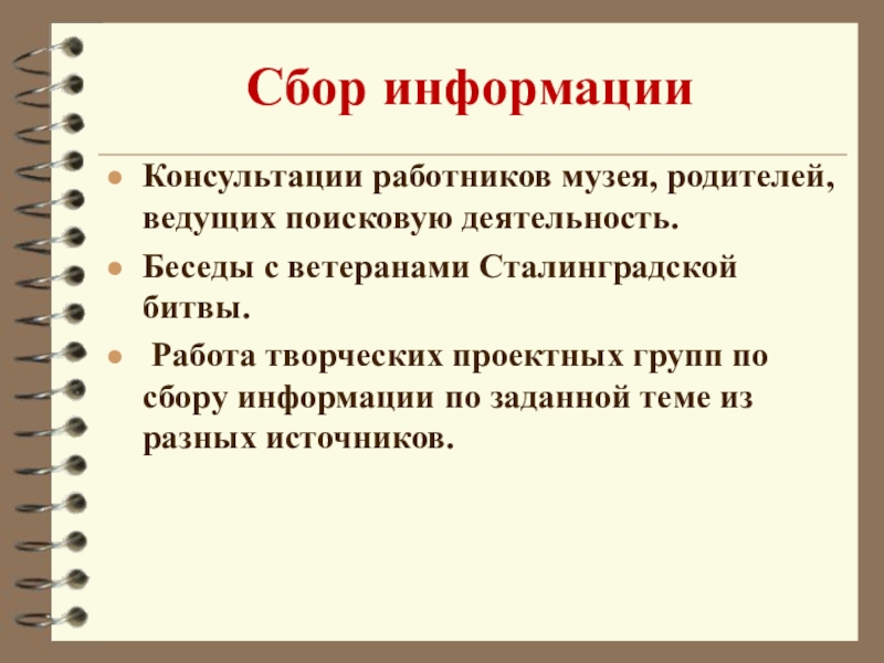 Работа творческих проектных групп по сбору информации по заданной теме из разных источников.