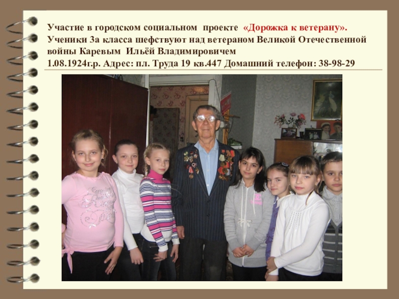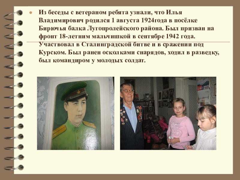Слайд 44Из беседы с ветераном ребята узнали, что Илья Владимирович родился 1