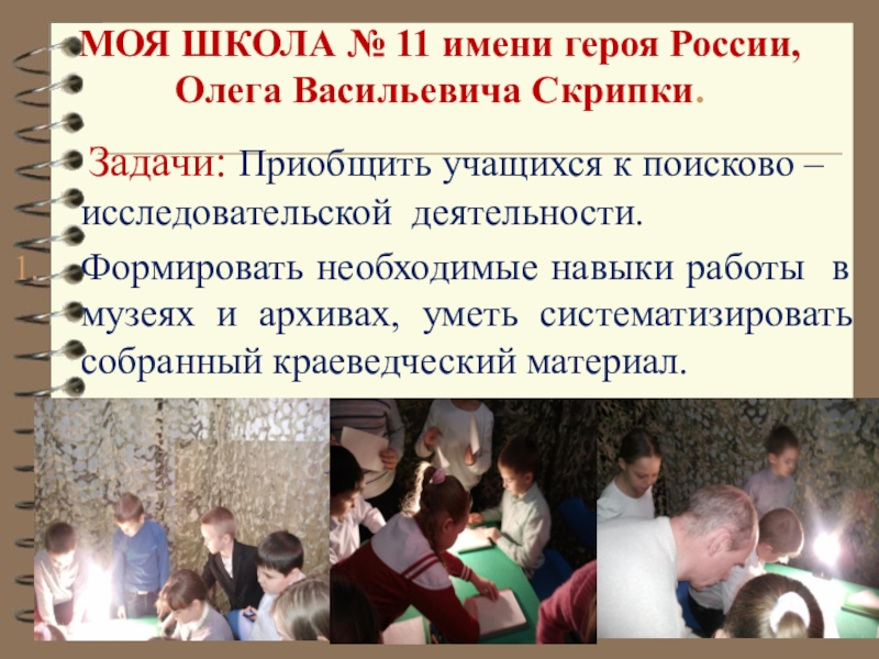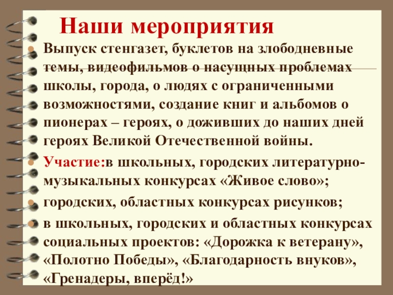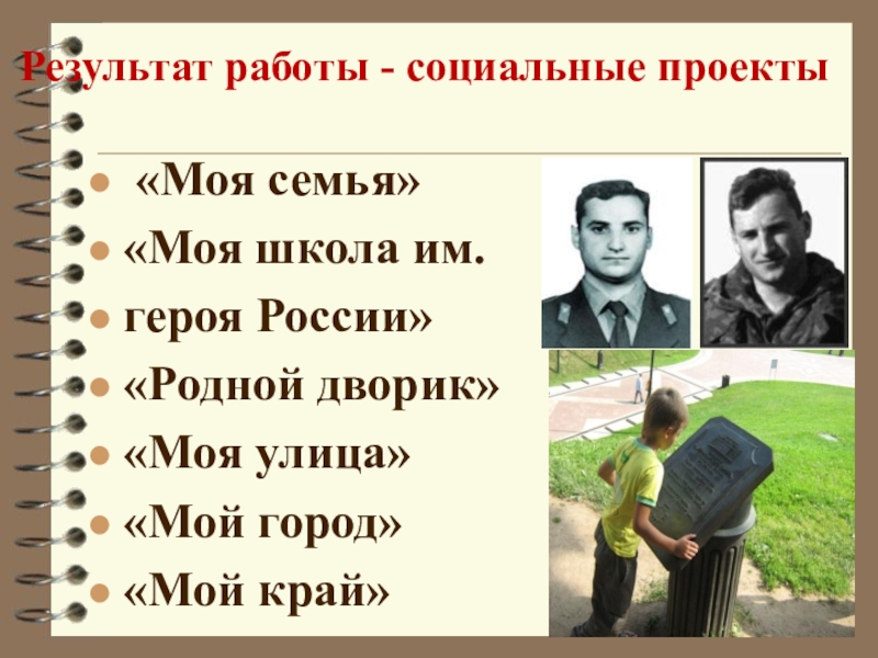 школы, города, о людях с ограниченными возможностями, создание книг и альбомов о пионерах – героях, о доживших до наших дней героях Великой Отечественной войны.