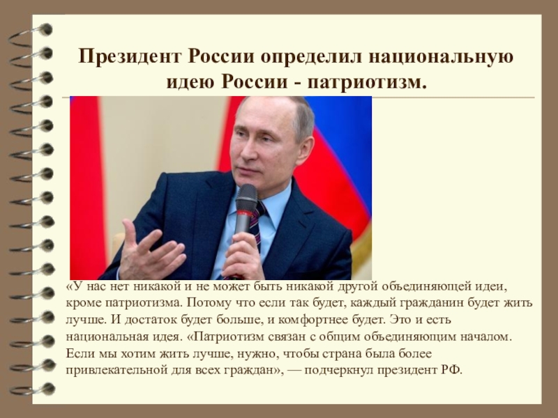 Слайд 3Президент России определил национальную идею России - патриотизм.