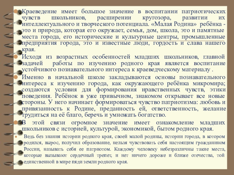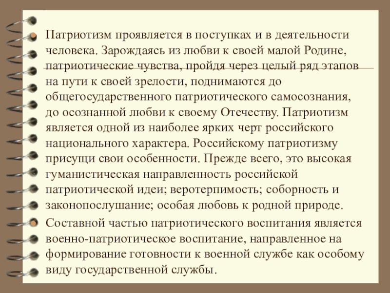 к своей малой Родине, патриотические чувства, пройдя через целый ряд этапов на пути к своей зрелости, поднимаются до общегосударственного патриотического самосознания, до осознанной любви к своему Отечеству. Патриотизм является одной из наиболее ярких черт российского национального характера. Российскому патриотизму присущи свои особенности. Прежде всего, это высокая гуманистическая направленность российской патриотической идеи; веротерпимость; соборность и законопослушание; особая любовь к родной природе.