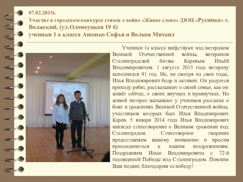 Ученики 1а класса шефствуют над ветераном Великой Отечественной войны, ветераном Сталинградской битвы Каревым Ильёй Владимировичем. 1 августа 2015 года ветерану исполнился 91 год. Но, не смотря на свои годы, Илья Владимирович бодр и активен. Он радуется приходу ребят, рассказывает о своей семье, как он живёт сейчас, о своих внучках и правнучках. Но живой интерес вызывают у учеников рассказы о боях и сражениях Великой Отечественной войны, участником которых был Илья Владимирович Карев. 5 января 2014 года Илья Владимирович написал стихотворение о Великом сражении под Сталинградом. Стихотворное творение предоставляем вашему вниманию и просим присоединиться к нашим поздравлениям. Поздравляем Илью Владимировича с 72-й годовщиной Победы под Сталинградом. Помним Ваш подвиг, благодарим за победу!