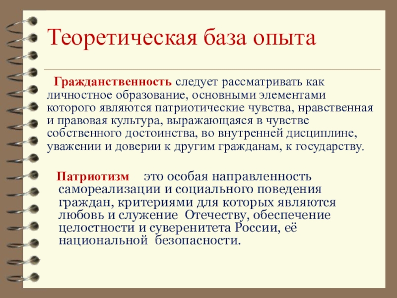 Патриотизм – это особая направленность самореализации и социального поведения граждан, критериями для которых являются любовь и служение Отечеству, обеспечение целостности и суверенитета России, её национальной безопасности.
