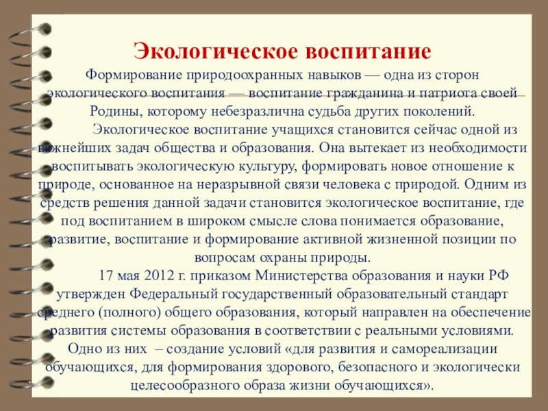 Экологическое воспитание учащихся становится сейчас одной из важнейших задач общества и образования. Она вытекает из необходимости воспитывать экологическую культуру, формировать новое отношение к природе, основанное на неразрывной связи человека с природой. Одним из средств решения данной задачи становится экологическое воспитание, где под воспитанием в широком смысле слова понимается образование, развитие, воспитание и формирование активной жизненной позиции по вопросам охраны природы.