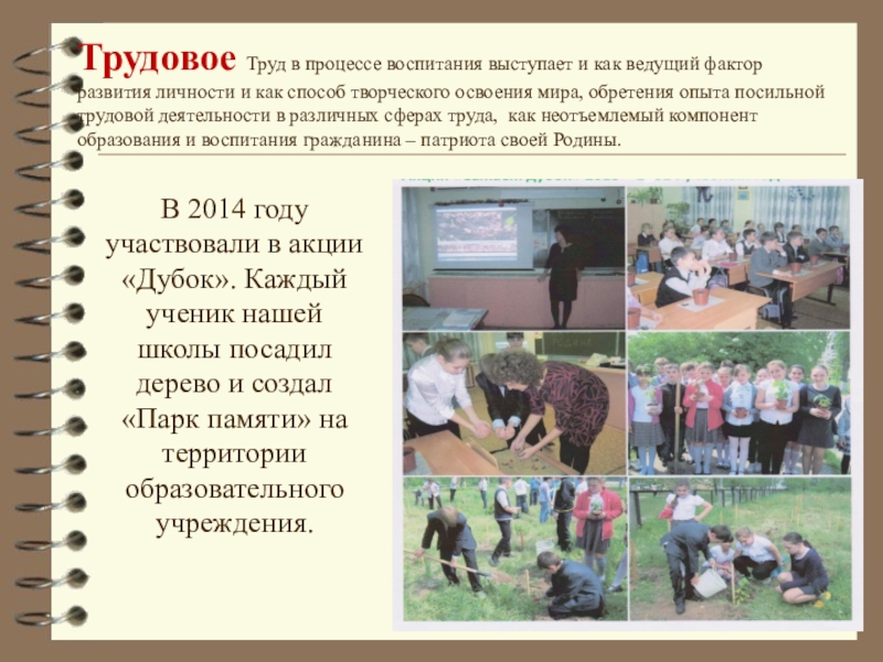 В 2014 году участвовали в акции «Дубок». Каждый ученик нашей школы посадил дерево и создал «Парк памяти» на территории образовательного учреждения.