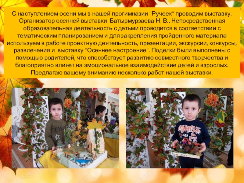 осенней выставки  Батырмурзаева Н. В.. Непосредственная образовательная деятельность с детьми проводится в соответствии с тематическим планированием и для закрепления пройденного материала используем в работе проектную деятельность, презентации, экскурсии, конкурсы, развлечения и  выставку "Осеннее настроение". Поделки были выполнены с помощью родителей, что способствует развитию совместного творчества и благоприятно влияет на эмоциональное взаимодействие детей и взрослых. Предлагаю вашему вниманию несколько работ нашей выставки.