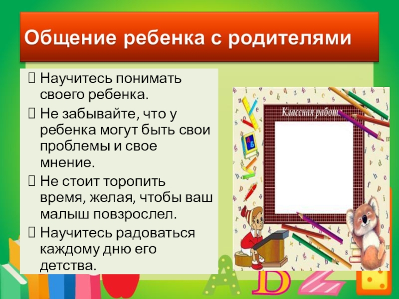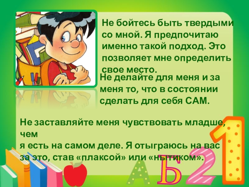 понять и узнать его, относитесь к нему с уважением, придерживайтесь наиболее прогрессивных методов воспитания и постоянной линии поведения.
