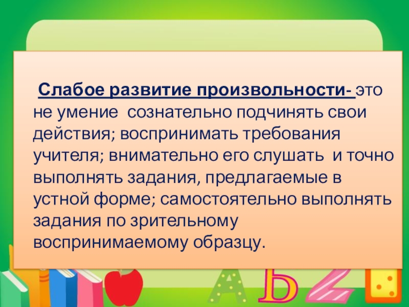 Слабое развитие произвольности- это не умение сознательно подчинять свои действия; воспринимать