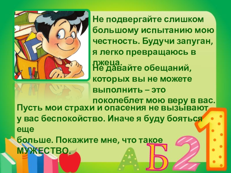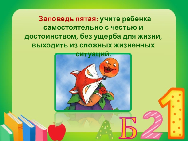 Слайд 8 Заповедь пятая: учите ребенка самостоятельно с честью и достоинством, без