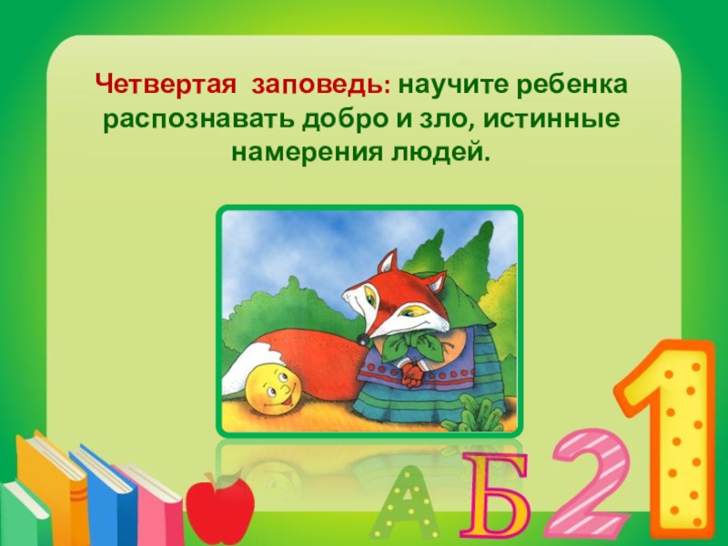 Слайд 7Четвертая заповедь: научите ребенка распознавать добро и зло, истинные намерения людей.