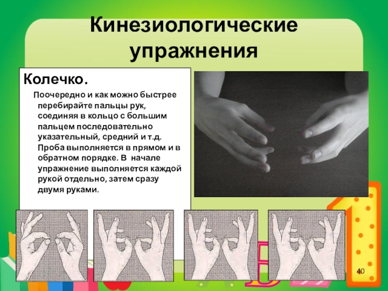 пальцы рук, соединяя в кольцо с большим пальцем последовательно указательный, средний и т.д. Проба выполняется в прямом и в обратном порядке. В начале упражнение выполняется каждой рукой отдельно, затем сразу двумя руками.