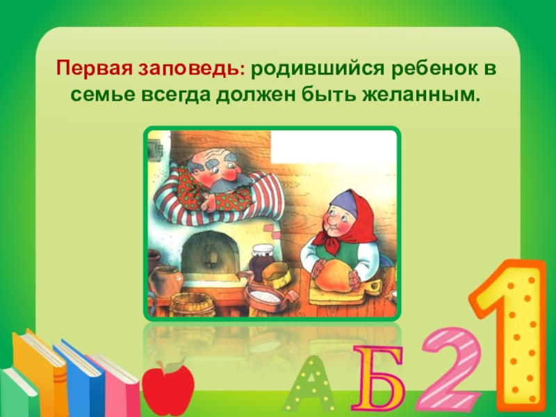 Слайд 4Первая заповедь: родившийся ребенок в семье всегда должен быть желанным.