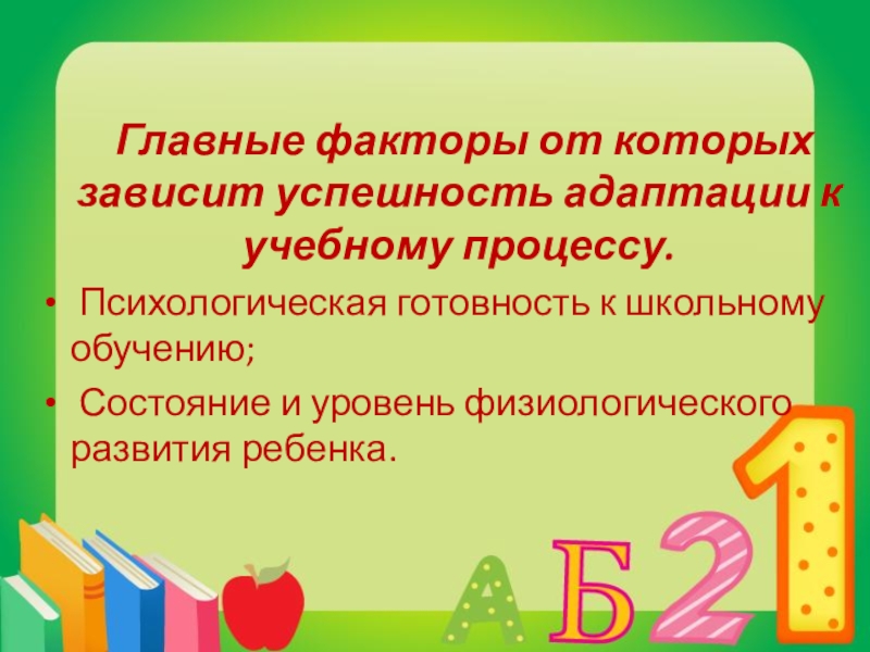 Слайд 10 Главные факторы от которых зависит успешность адаптации к учебному процессу.