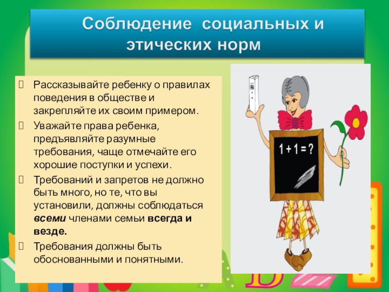 Слайд 31Рассказывайте ребенку о правилах поведения в обществе и закрепляйте их своим