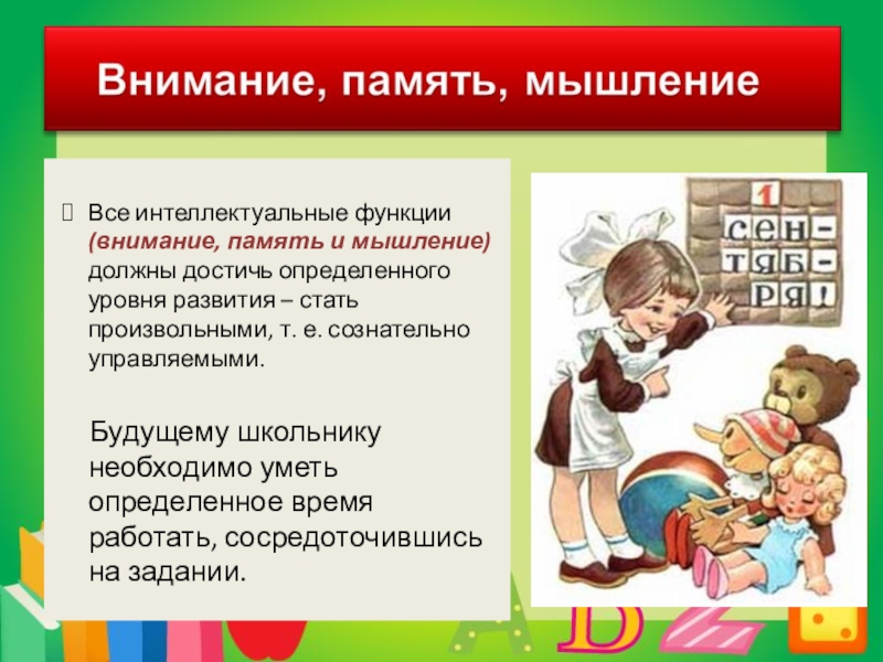 Будущему школьнику необходимо уметь определенное время работать, сосредоточившись на задании.