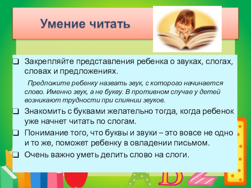 Слайд 28Закрепляйте представления ребенка о звуках, слогах, словах и предложениях.