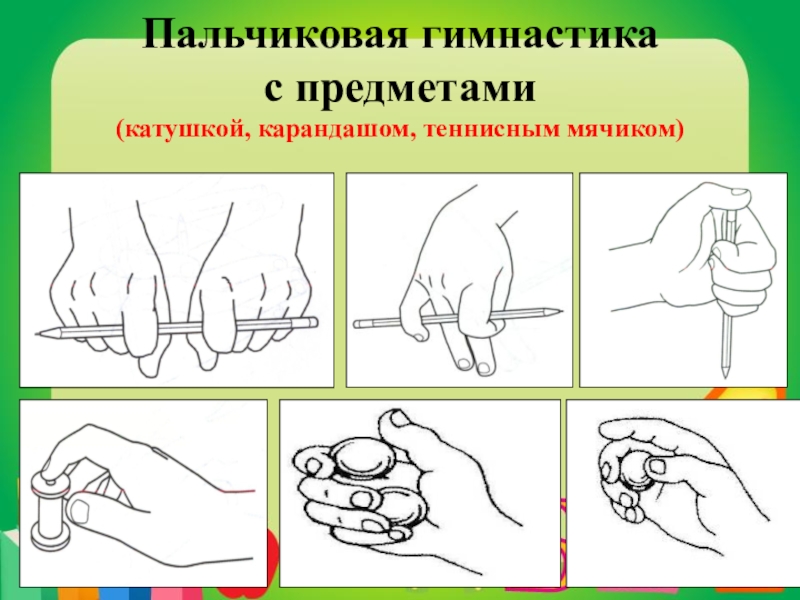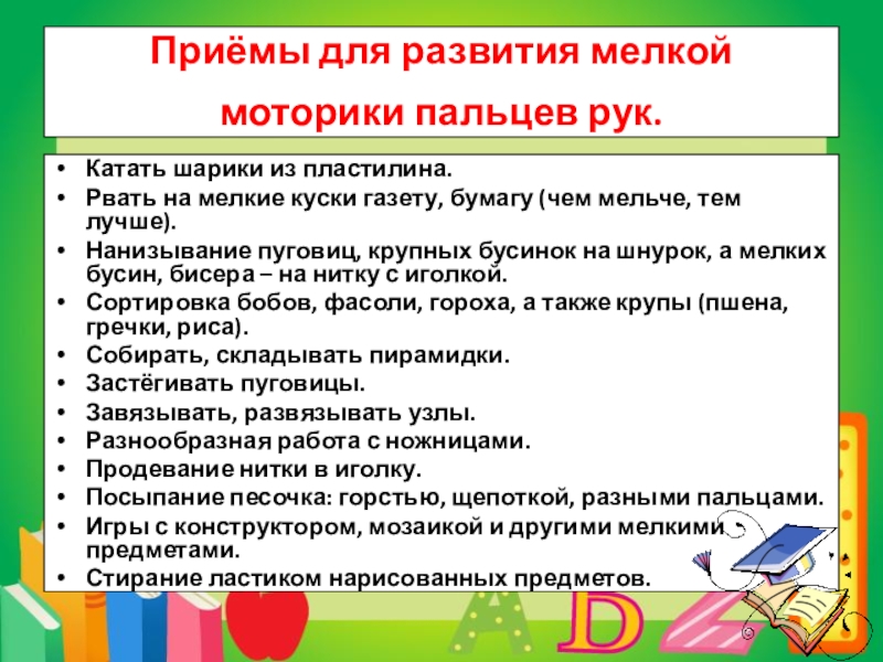 Слайд 38Приёмы для развития мелкой моторики пальцев рук.