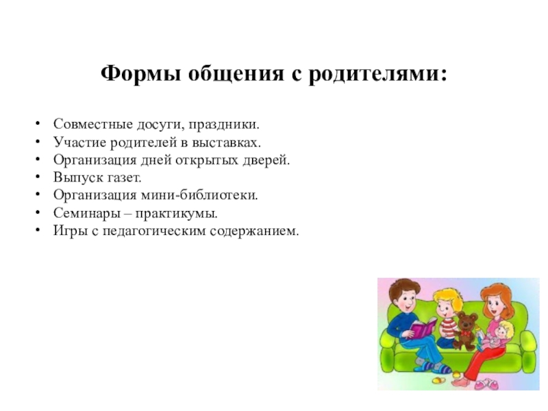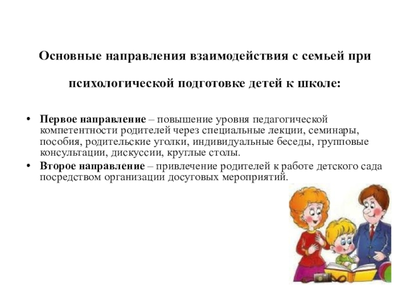 Первое направление – повышение уровня педагогической компетентности родителей через специальные лекции, семинары, пособия, родительские уголки, индивидуальные беседы, групповые консультации, дискуссии, круглые столы.