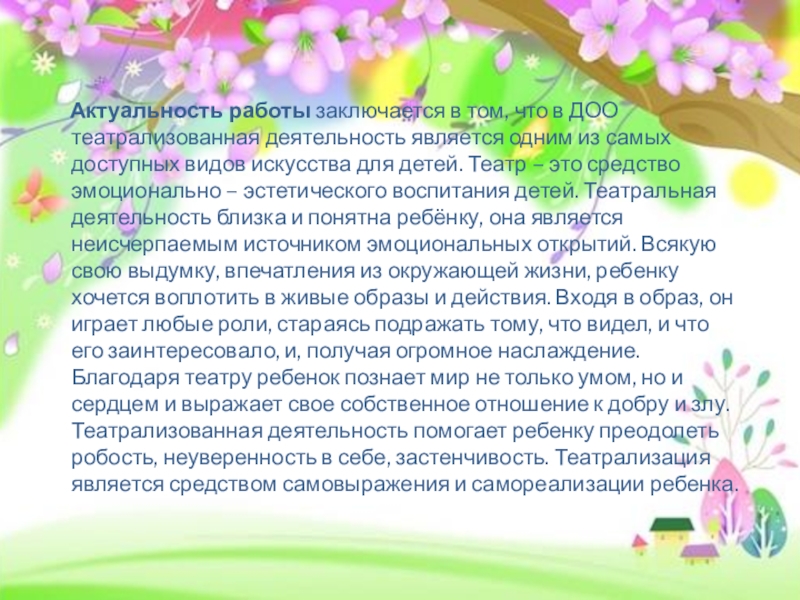 театрализованная деятельность является одним из самых доступных видов искусства для детей. Театр – это средство эмоционально – эстетического воспитания детей. Театральная деятельность близка и понятна ребёнку, она является неисчерпаемым источником эмоциональных открытий. Всякую свою выдумку, впечатления из окружающей жизни, ребенку хочется воплотить в живые образы и действия. Входя в образ, он играет любые роли, стараясь подражать тому, что видел, и что его заинтересовало, и, получая огромное наслаждение. Благодаря театру ребенок познает мир не только умом, но и сердцем и выражает свое собственное отношение к добру и злу. Театрализованная деятельность помогает ребенку преодолеть робость, неуверенность в себе, застенчивость. Театрализация является средством самовыражения и самореализации ребенка.