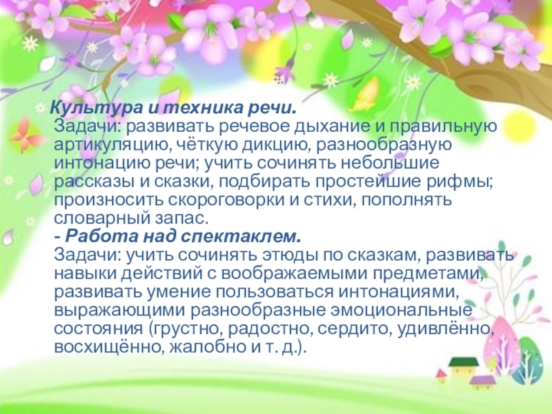 артикуляцию, чёткую дикцию, разнообразную интонацию речи; учить сочинять небольшие рассказы и сказки, подбирать простейшие рифмы; произносить скороговорки и стихи, пополнять словарный запас.