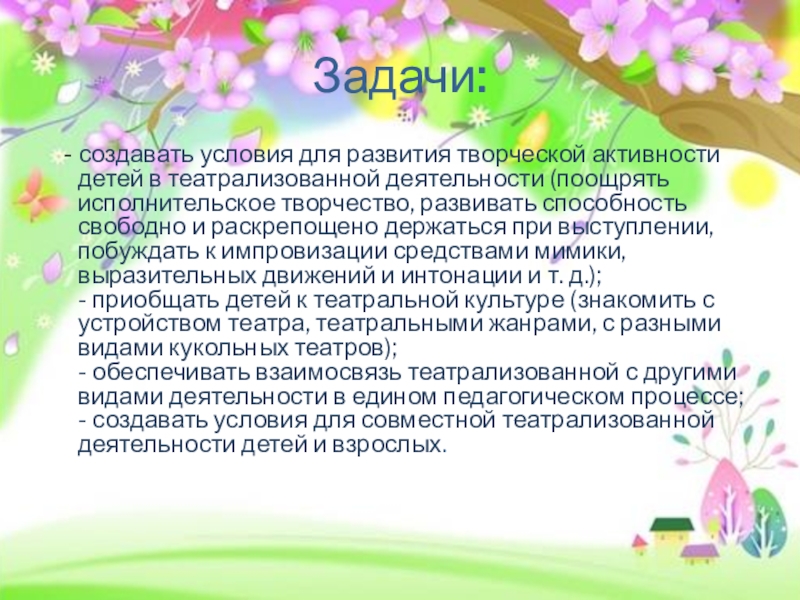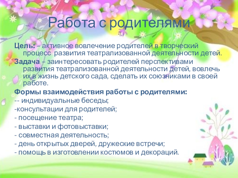 Задача – заинтересовать родителей перспективами развития театрализованной деятельности детей, вовлечь их в жизнь детского сада, сделать их союзниками в своей работе.