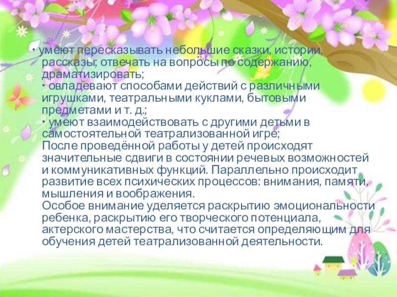 Особое внимание уделяется раскрытию эмоциональности ребенка, раскрытию его творческого потенциала, актерского мастерства, что считается определяющим для обучения детей театрализованной деятельности.