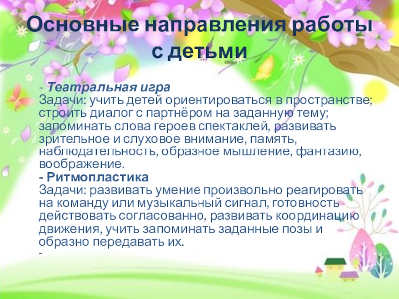 пространстве; строить диалог с партнёром на заданную тему; запоминать слова героев спектаклей, развивать зрительное и слуховое внимание, память, наблюдательность, образное мышление, фантазию, воображение.