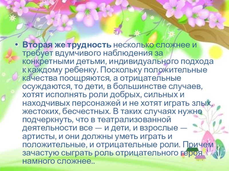детьми, индивидуального подхода к каждому ребенку. Поскольку положительные качества поощряются, а отрицательные осуждаются, то дети, в большинстве случаев, хотят исполнять роли добрых, сильных и находчивых персонажей и не хотят играть злых, жестоких, бесчестных. В таких случаях нужно подчеркнуть, что в театрализованной деятельности все — и дети, и взрослые — артисты, и они должны уметь играть и положительные, и отрицательные роли. Причем зачастую сыграть роль отрицательного героя намного сложнее..
