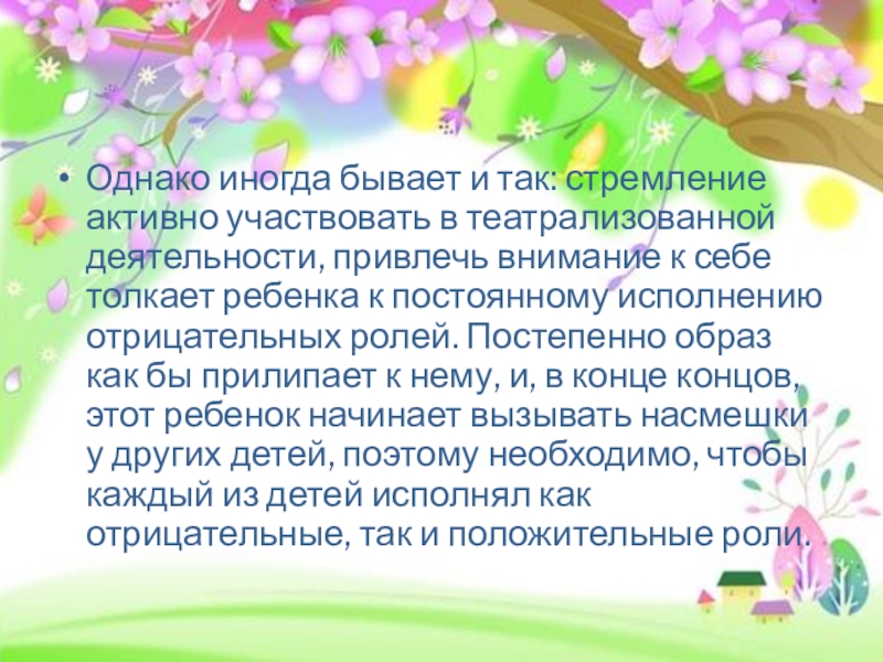 привлечь внимание к себе толкает ребенка к постоянному исполнению отрицательных ролей. Постепенно образ как бы прилипает к нему, и, в конце концов, этот ребенок начинает вызывать насмешки у других детей, поэтому необходимо, чтобы каждый из детей исполнял как отрицательные, так и положительные роли.