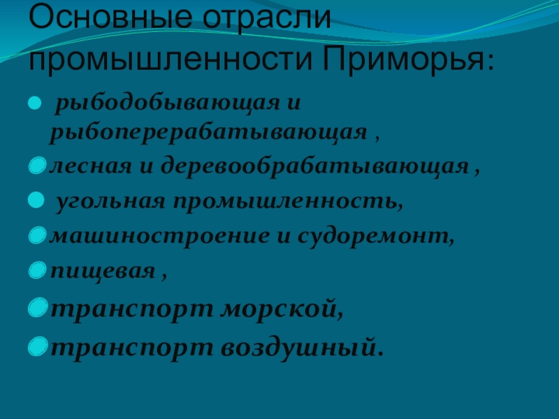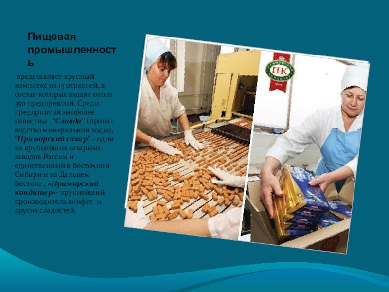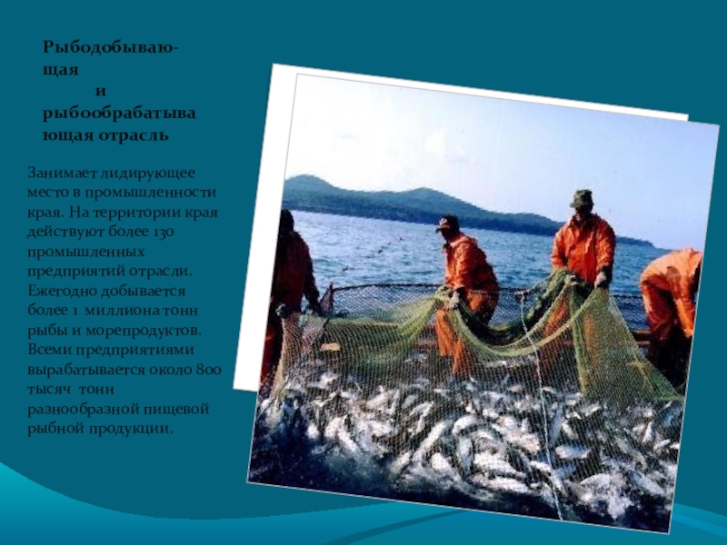Занимает лидирующее место в промышленности края. На территории края действуют более 130 промышленных предприятий отрасли. Ежегодно добывается более 1 миллиона тонн рыбы и морепродуктов. Всеми предприятиями вырабатывается около 800 тысяч тонн разнообразной пищевой рыбной продукции.