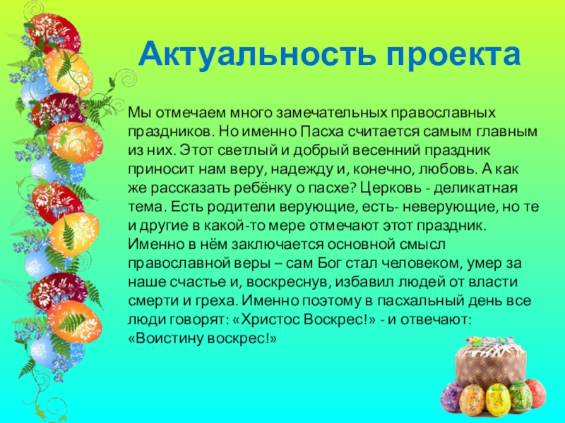 самым главным из них. Этот светлый и добрый весенний праздник приносит нам веру, надежду и, конечно, любовь. А как же рассказать ребёнку о пасхе? Церковь - деликатная тема. Есть родители верующие, есть- неверующие, но те и другие в какой-то мере отмечают этот праздник. Именно в нём заключается основной смысл православной веры – сам Бог стал человеком, умер за наше счастье и, воскреснув, избавил людей от власти смерти и греха. Именно поэтому в пасхальный день все люди говорят: «Христос Воскрес!» - и отвечают: «Воистину воскрес!»