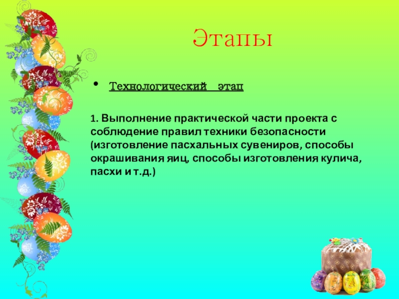 безопасности (изготовление пасхальных сувениров, способы окрашивания яиц, способы изготовления кулича, пасхи и т.д.)