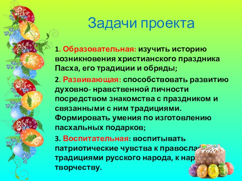 2. Развивающая: способствовать развитию духовно- нравственной личности посредством знакомства с праздником и связанными с ним традициями. Формировать умения по изготовлению пасхальных подарков;