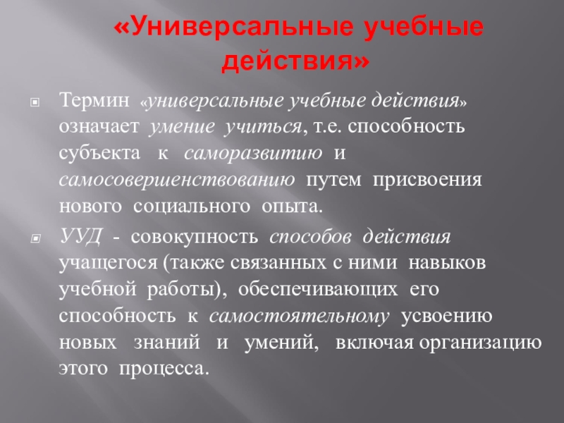 УУД - совокупность способов действия учащегося (также связанных с ними навыков учебной работы), обеспечивающих его способность к самостоятельному усвоению новых знаний и умений, включая организацию этого процесса.